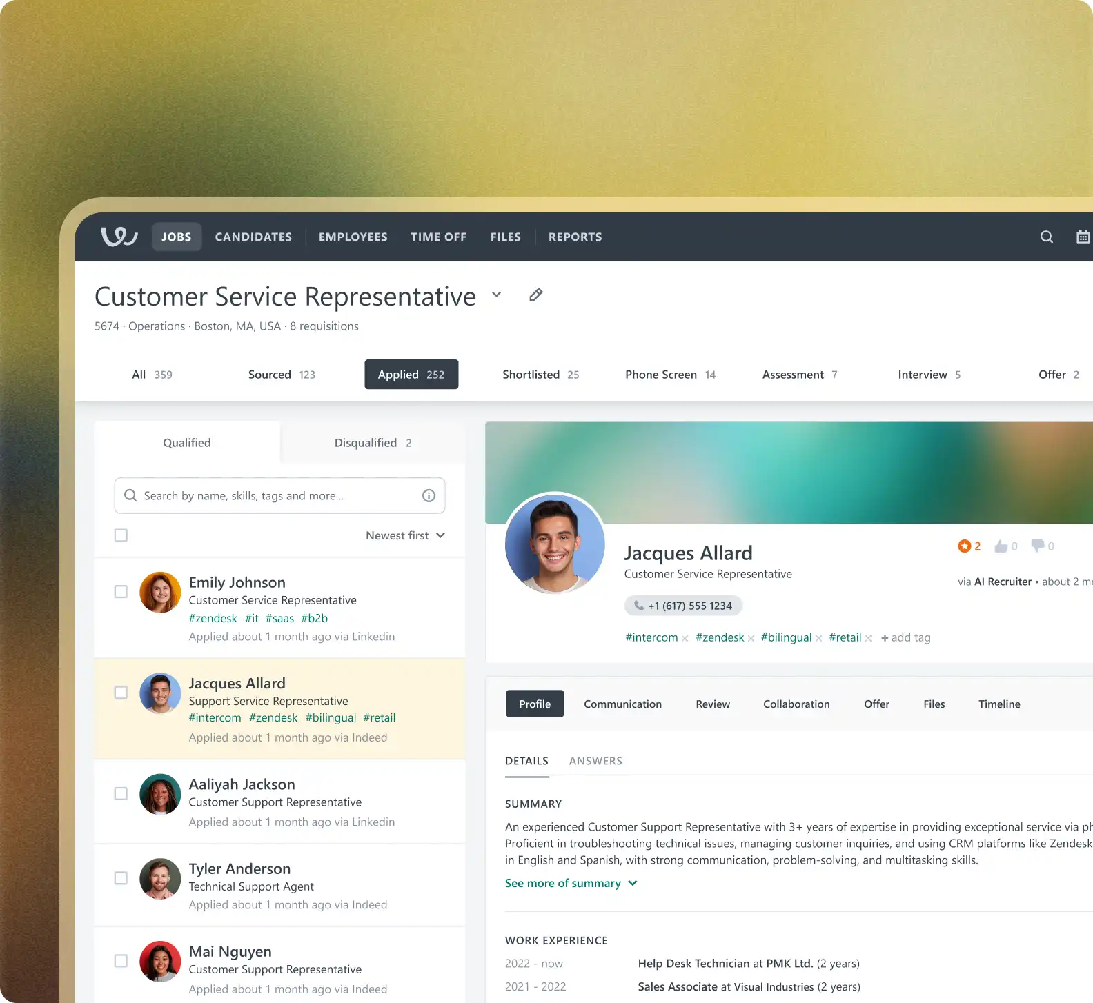 Its ATS is tightly integrated into the HR system, allowing candidate data to flow directly into employee records once hired. This makes it easier for HR teams to manage transitions without switching tools, but it also means recruiting features are more basic compared to dedicated ATS platforms.