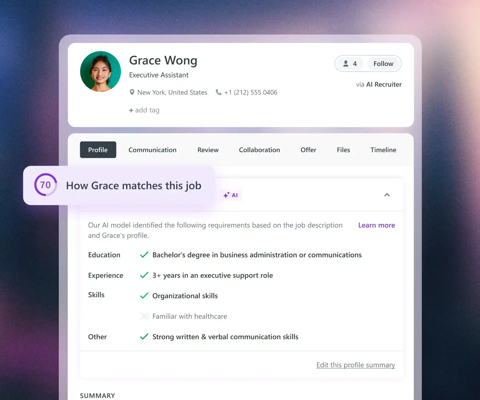 - AI-assisted screening with match scores, summaries, and resume parsing