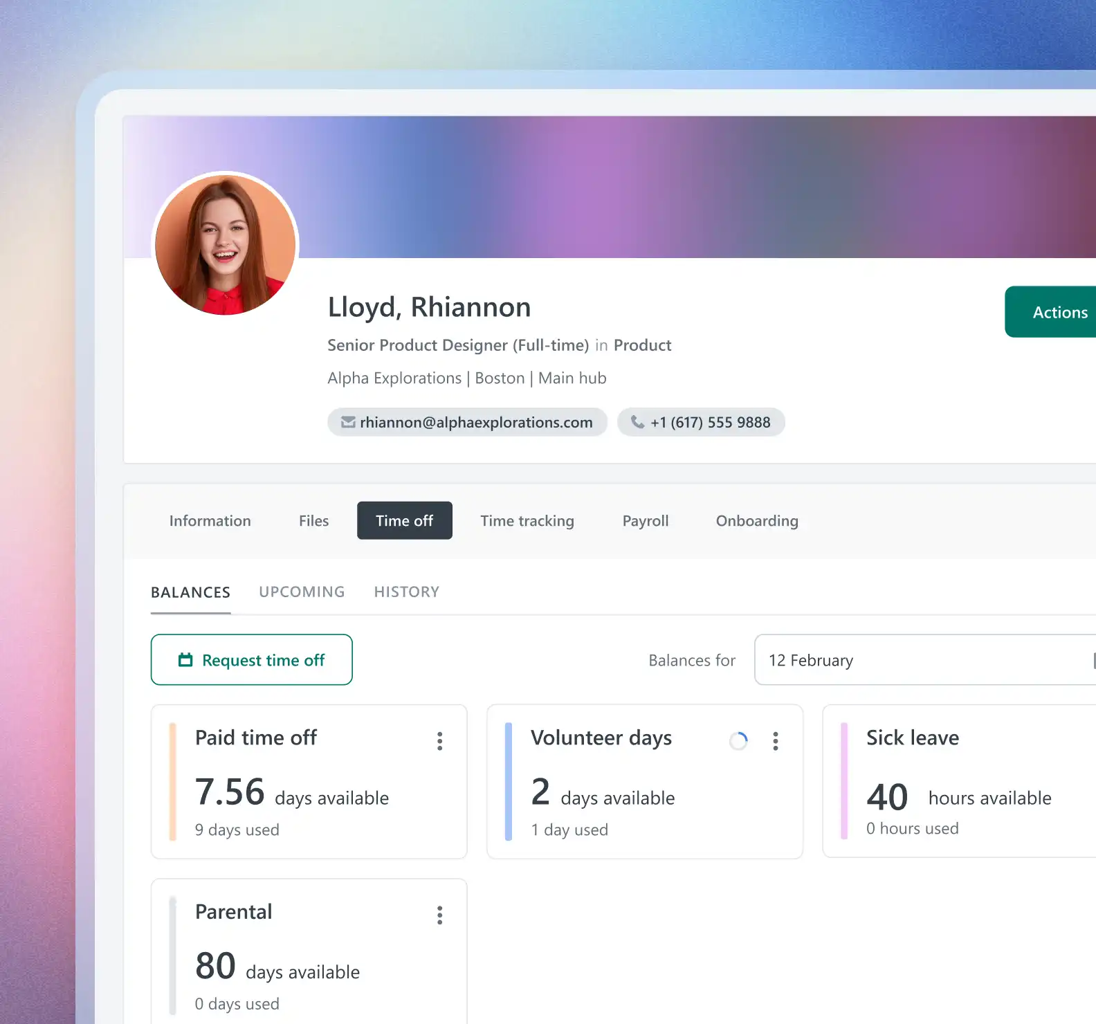 - HRIS features including employee profiles, org charts, time-off tracking, and payroll integrations