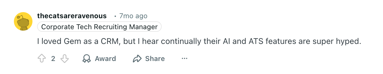 Gem heavily positions itself as an AI-first recruiting platform. But in practice, some users feel the AI doesn’t consistently outperform manual workflows or competing tools.