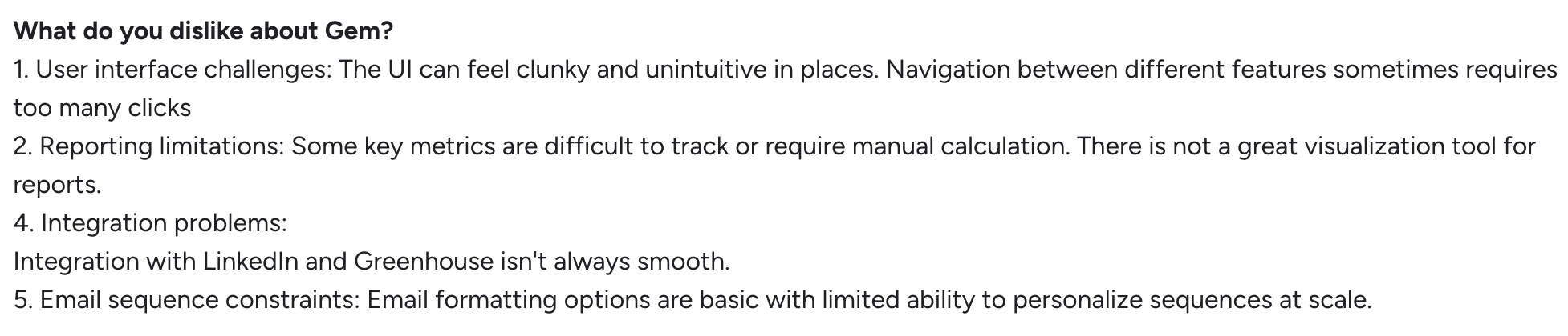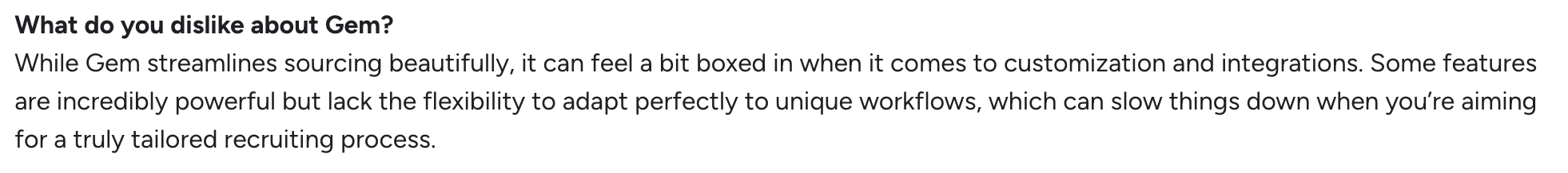 Gem is strong when it comes to sourcing and CRM, but as teams scale or try to expand beyond sourcing, some consistent gaps start to show up in real user feedback.