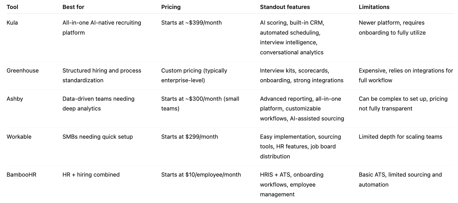 Bottom line: Kula is a strong option for teams that want to reduce tool fragmentation and improve hiring efficiency. It is particularly useful for organizations that currently rely on multiple tools for sourcing, scheduling, and reporting and want to consolidate those workflows into one system with AI built-in from the ground up.