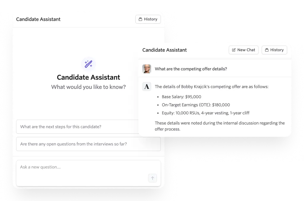 - AI-powered recruiting workflows: Includes AI-assisted candidate search, outreach personalization, and a candidate assistant that helps recruiters quickly access context and draft communication.