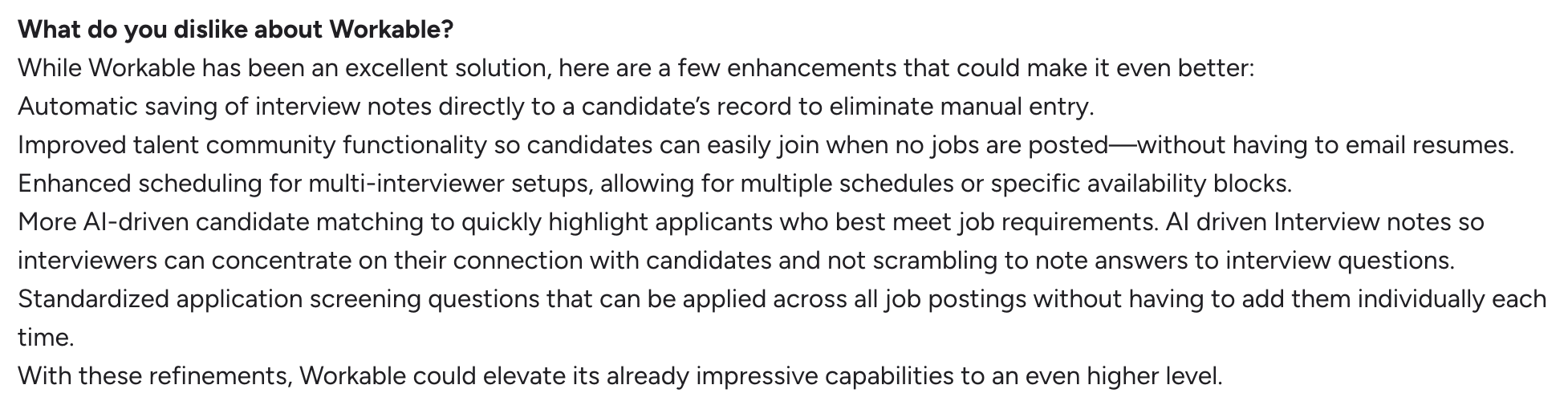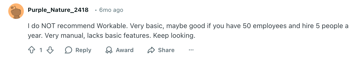 - Automation and AI feel surface-level: While Workable offers AI features, many users feel they don’t go deep enough to reduce manual effort. Screening, coordination, and insights still require significant hands-on work—especially at scale.