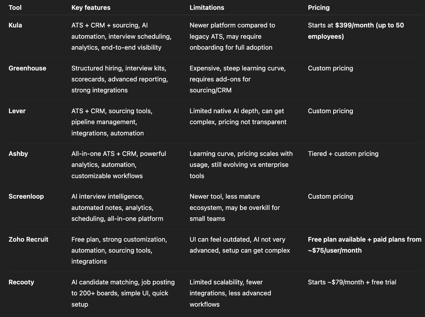 - If visibility is the issue → prioritize analytics (Ashby, Kula)