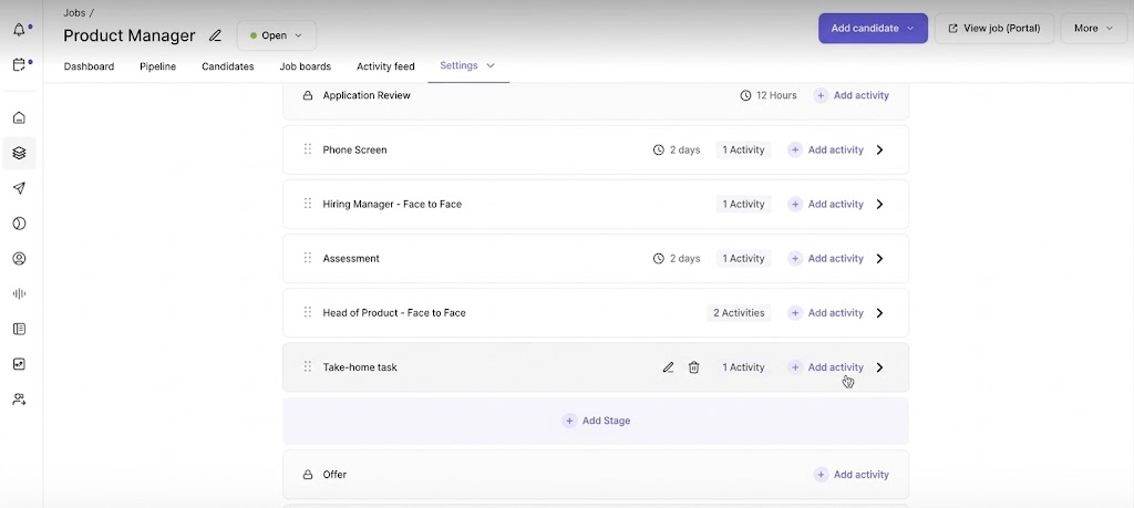 - Move candidates across stages without manual follow-ups