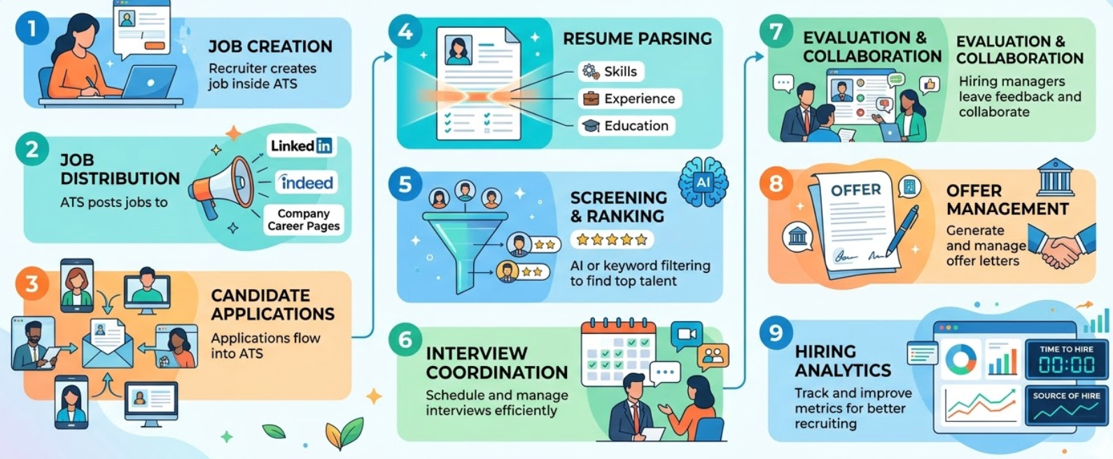 At a high level, an ATS turns hiring into a structured pipeline. But in practice, it’s coordinating three things at once: