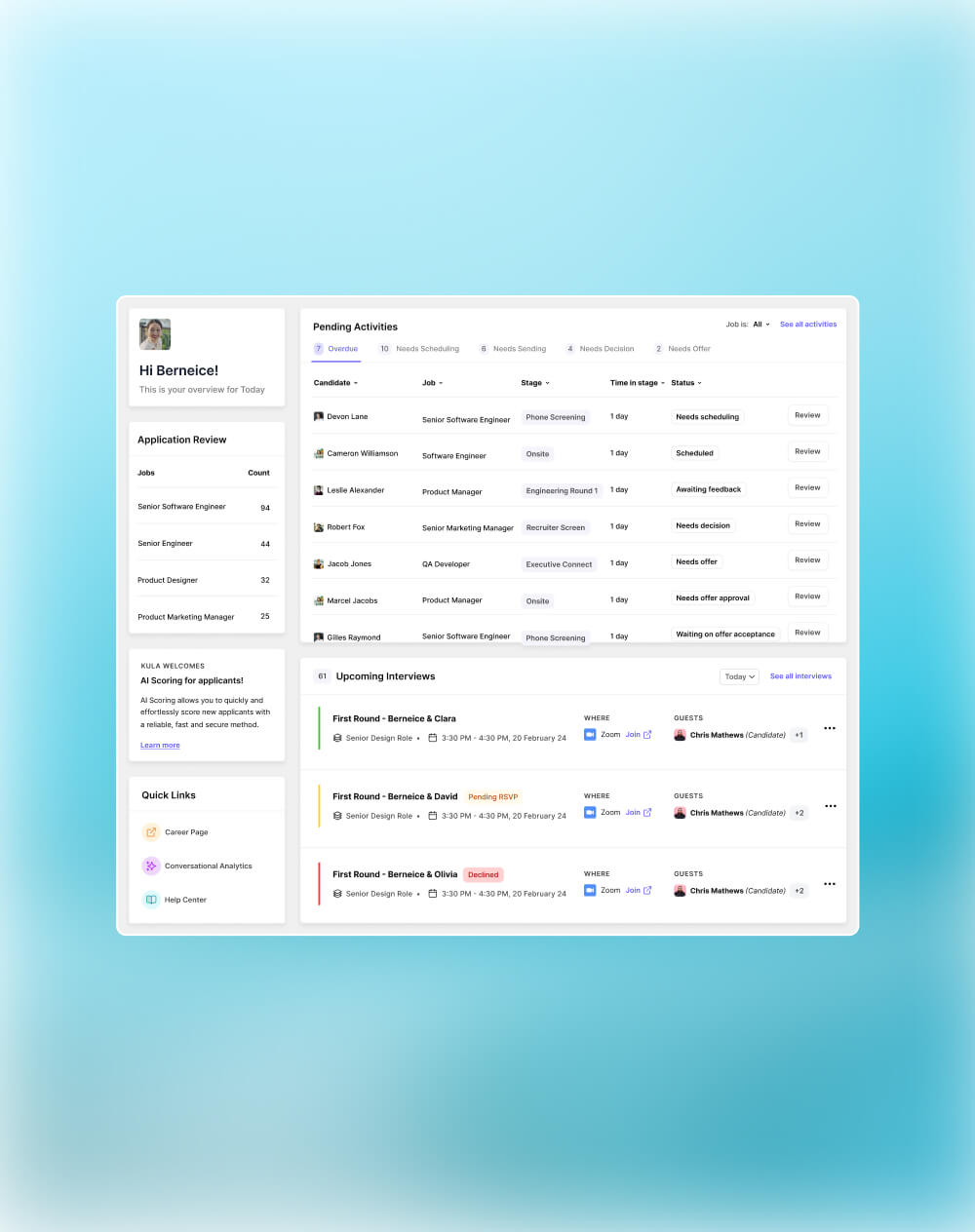 Small businesses often start with tools like BambooHR, Breezy HR, and Zoho Recruit because they are easy to set up and cover basic hiring needs. However, for teams expecting to scale quickly, platforms like Kula can be a better long-term fit. It offers a more complete system with built-in automation, scheduling, and analytics, so teams don’t need to switch tools as hiring volume and complexity grow.
