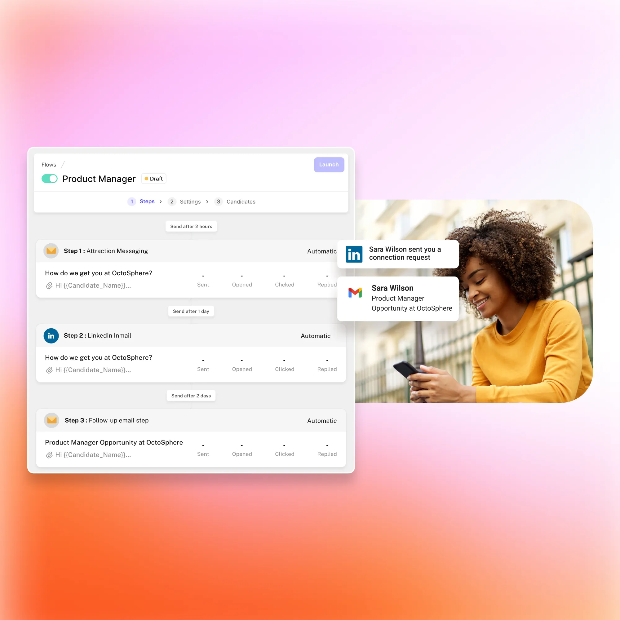 Bi-directional sync: Data flows both ways and stays aligned. For example, if a candidate status is updated in the ATS, the change will be reflected in the outreach tool as well.