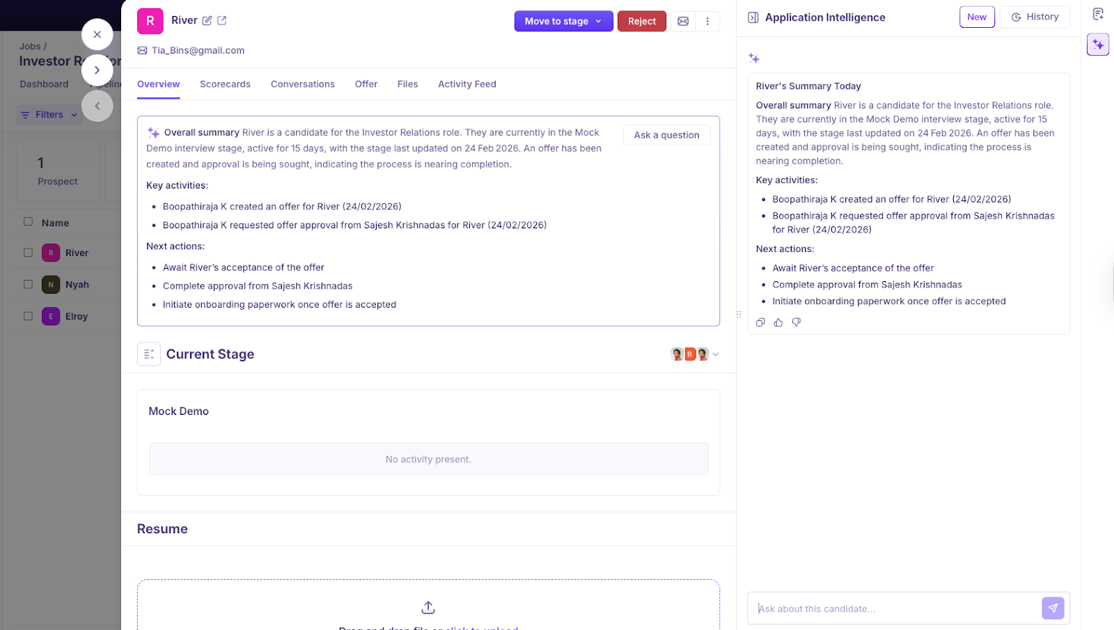 For example, whether a candidate is rejected, moved forward, or kept in a pipeline for future roles.