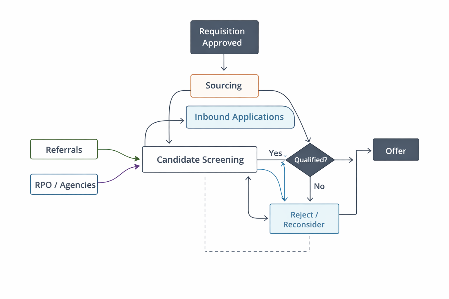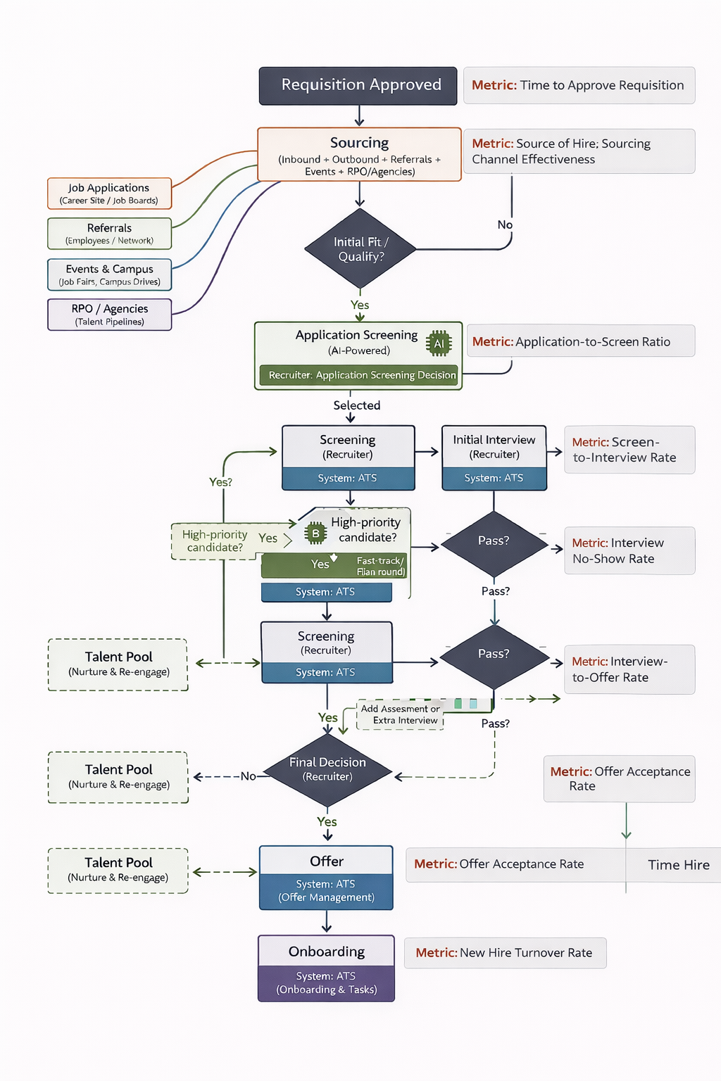 Instead of simply outlining steps like sourcing → screening → interviews, a good flowchart captures what happens at each step based on outcomes.