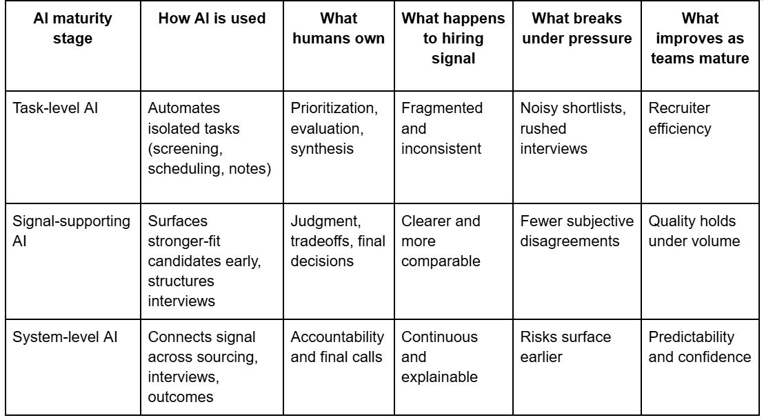 At the highest level of maturity, AI becomes part of the recruiting infrastructure rather than a layer on top of it. Signal flows across sourcing, interviews, and outcomes instead of living in silos. Leaders gain visibility while hiring is still in progress, which allows them to: