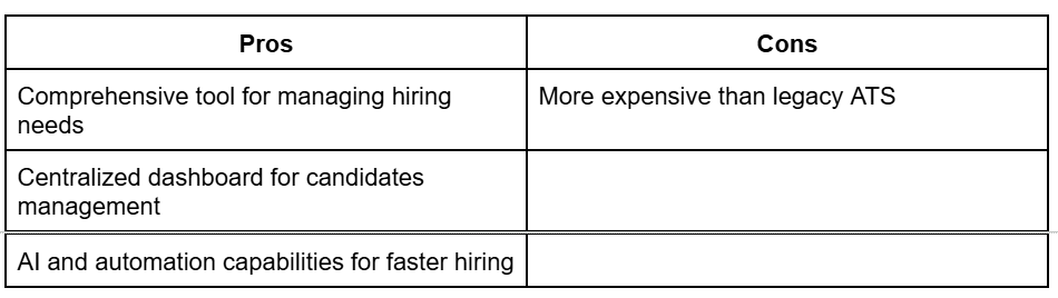 AI-native ATS offers all AI capabilities built into the tool itself for screening, interview transcripts, outreach messages, career pages, and job descriptions.