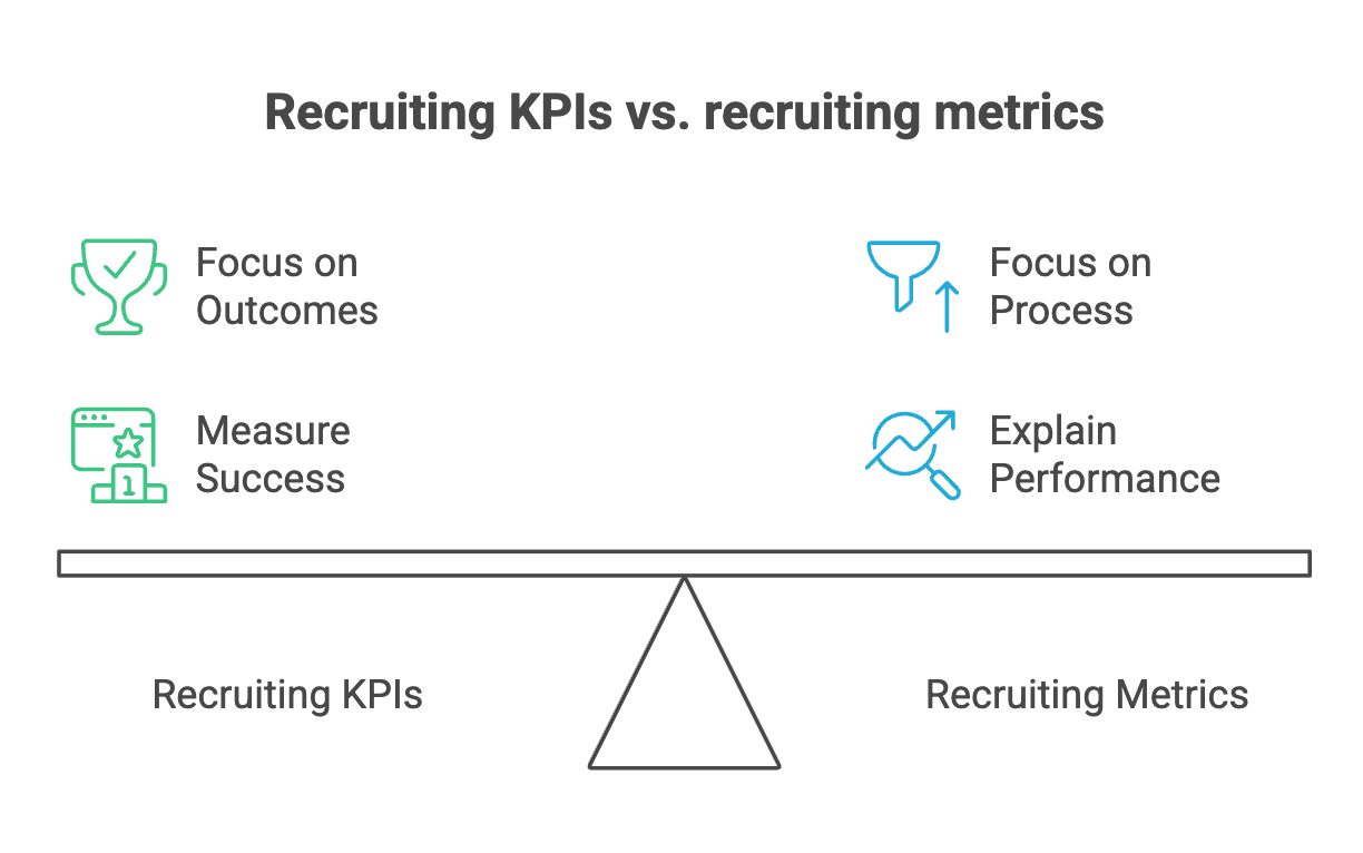 Before looking at specific hiring indicators, it’s important to clarify a distinction that often causes confusion: recruiting KPIs and recruiting metrics are not the same thing.