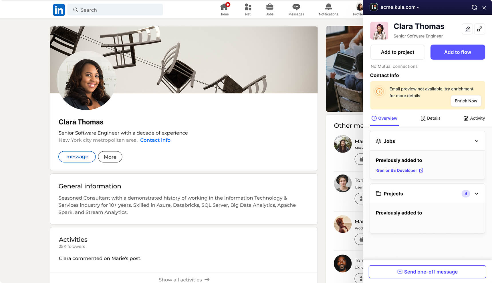 ATS tools like Kula’s LinkedIn Chrome extension make this process much easier. Recruiters can capture candidate profiles directly from LinkedIn and add them to the ATS with all relevant details automatically recorded. This eliminates manual data entry and keeps sourcing activity organized within the recruiting system.