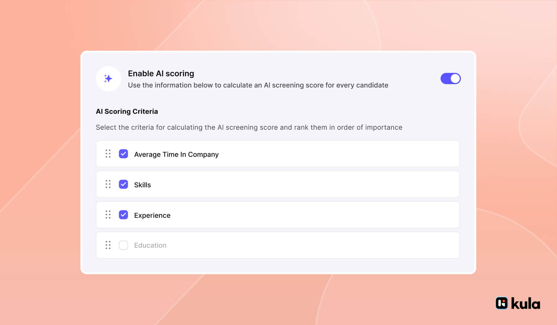 Kula’s AI Scoring analyzes candidate profiles against the requirements defined for a role—such as skills, experience, and qualifications—and automatically assigns a score indicating how closely a candidate matches the job criteria.