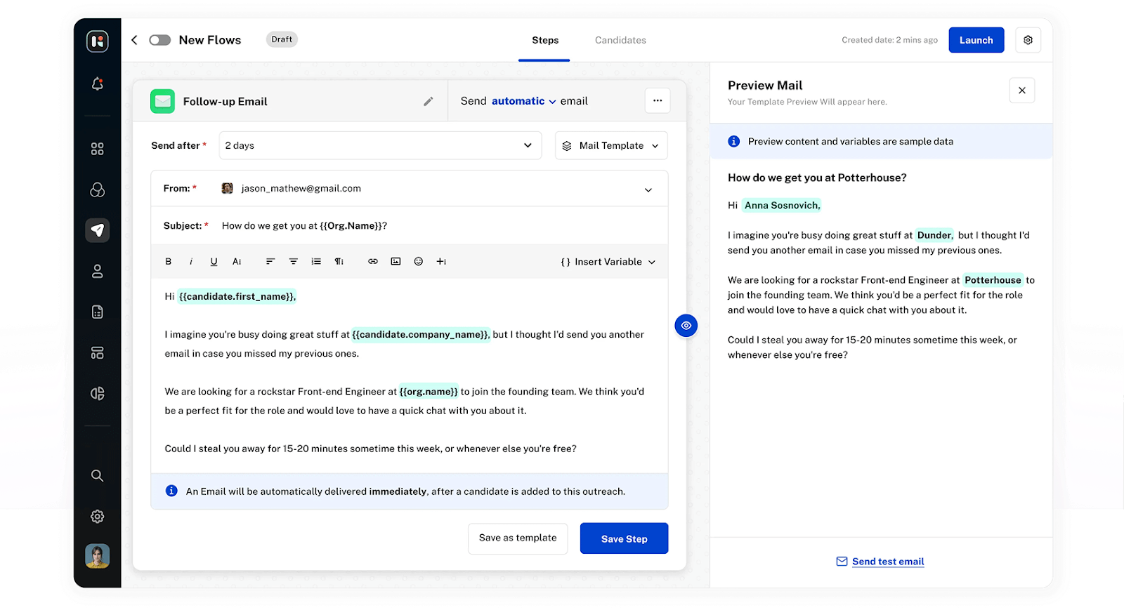 With Kula, recruiters can build automated yet human-sounding communication sequences that keep candidates in the loop without adding manual work. Each message can be personalized using dynamic tokens—name, role, interview stage, or even contextual details from the recruiter’s notes.